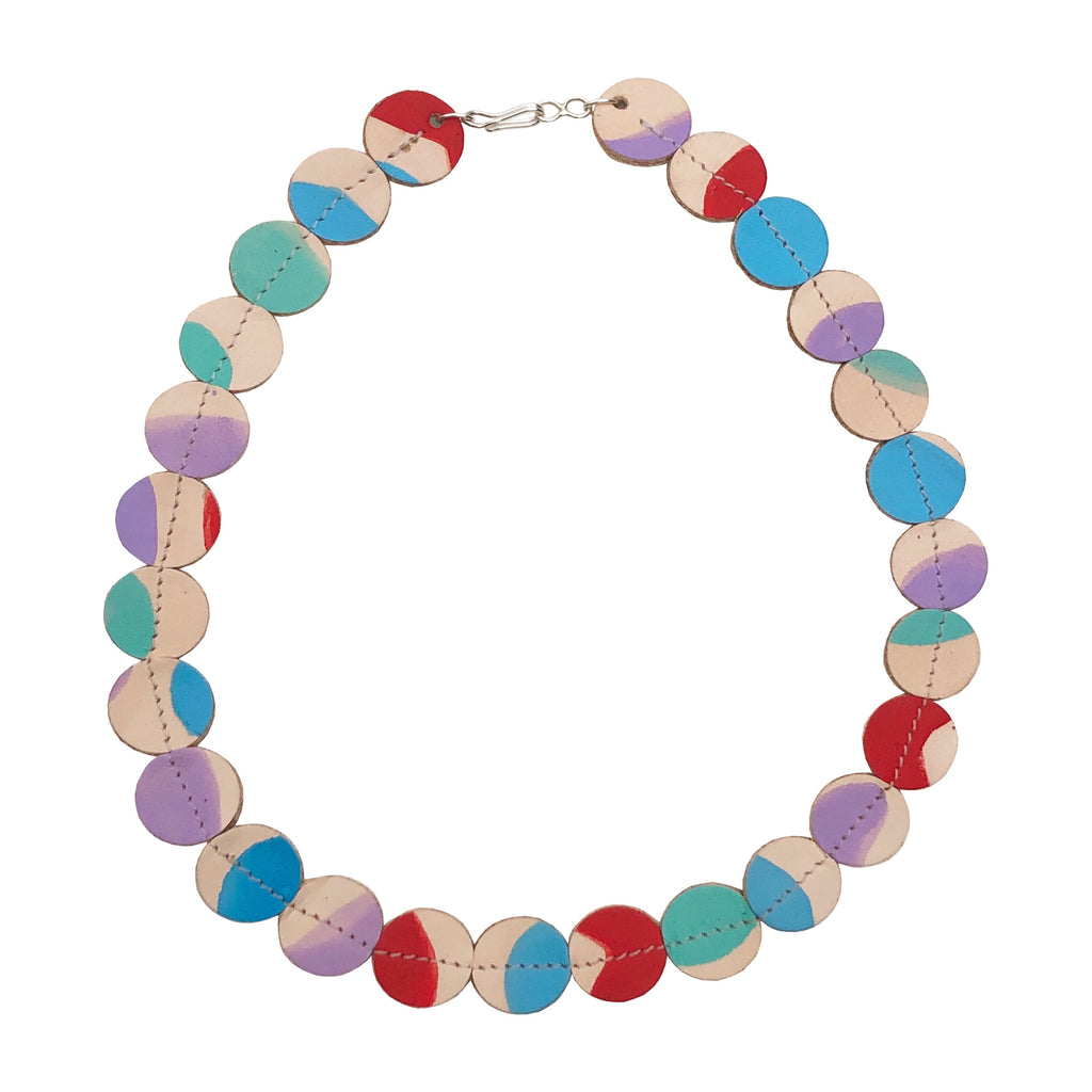 Håndmalet cirkler af vegetabilsk garvet kernelæder. Allergivenlig 925 Sterling Sølv hægte som er let og tage af og på. Produktet overholder EUs nikkeldirektiv.